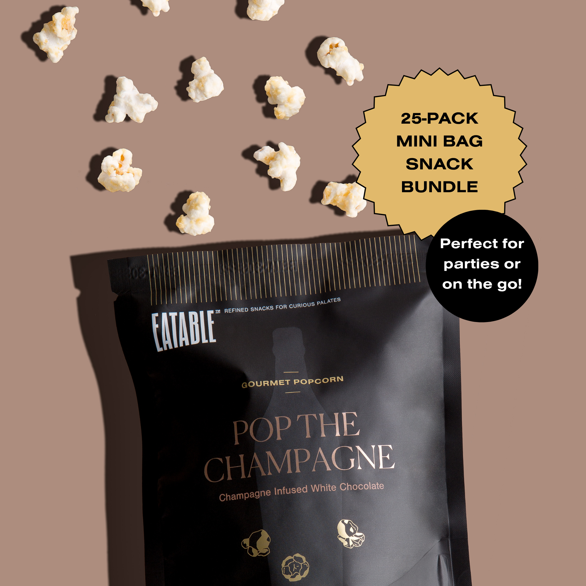 Make every moment feel like a celebration with Pop the Champagne™ – EATABLE's signature white chocolate popcorn that brings together luxury, fun, and pure indulgence in every bite.